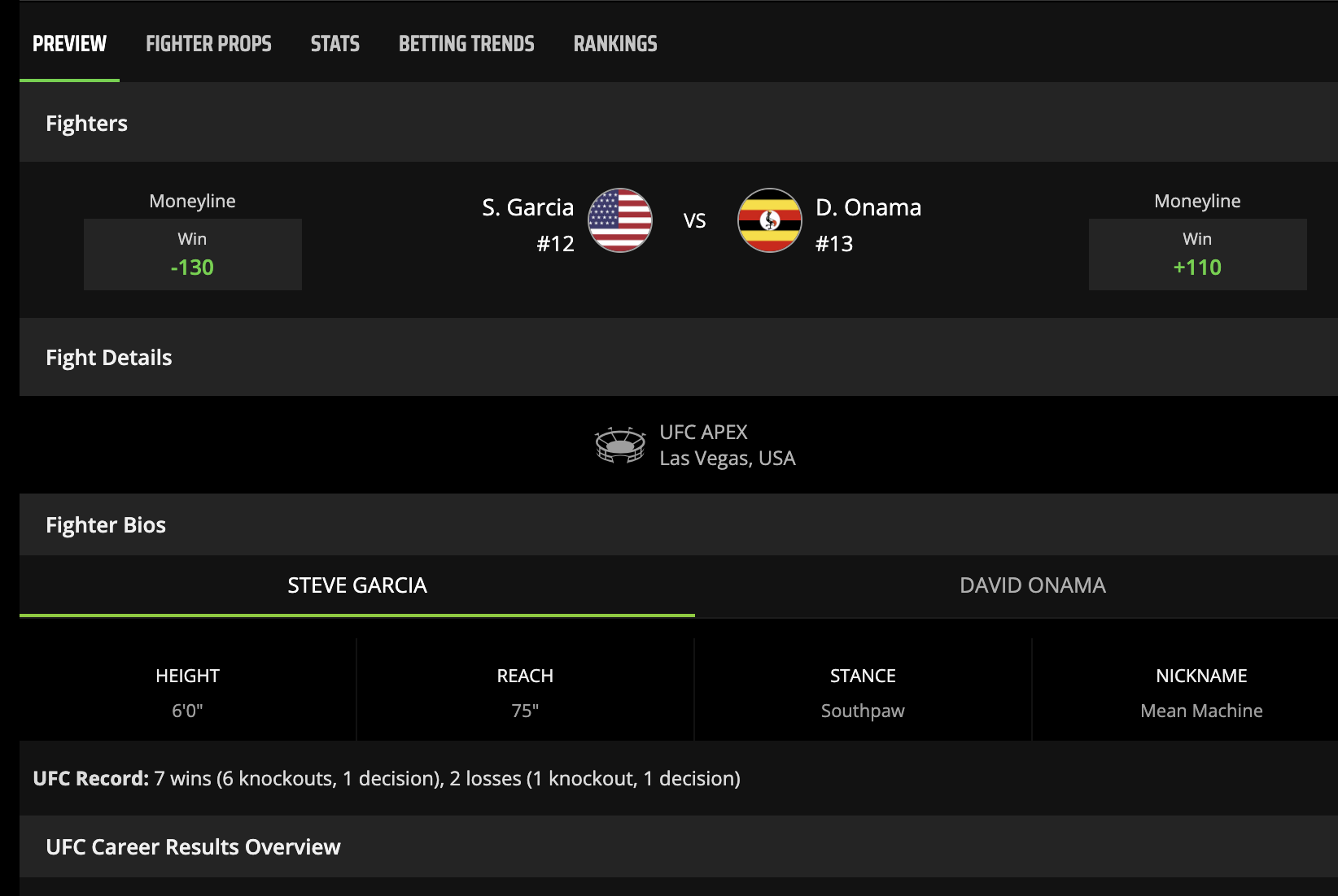 I'm taking Steve Garcia on this one at -130. Onama would be a good bet IF he had better defense to go with his striking, but at the moment I see him getting knocked out in this one.