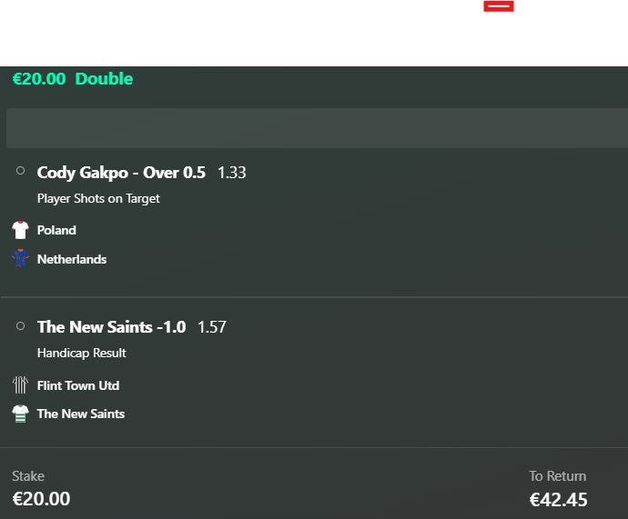 Today's Pick: The New Saints -1 Handicap(1.57) + Cody Gakpo over 0,5 shot on target(1.37) @ 2.15 -- 2 units