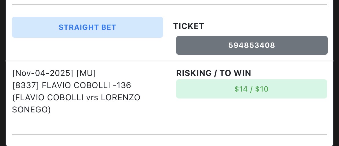 Let’s keep this one simple..Cobolli is simply the more talented player. This is a match he SHOULD win. That being said, Sonego is playing good tennis recently, which I think is why this line is closer than it should be. Give me Cobolli ML between these two compatriots.